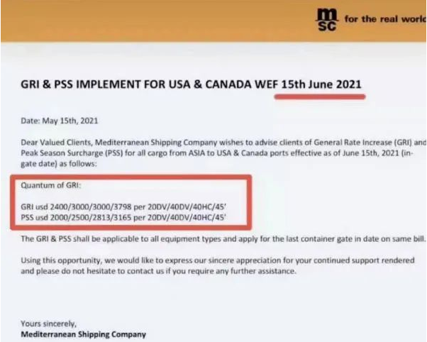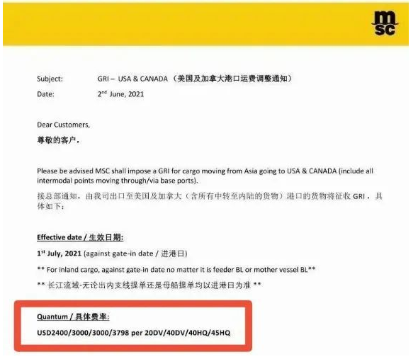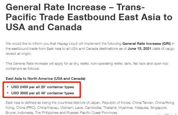 坑姐来了!端午才过去没几天,多家船公司就相继拉开了新一轮涨价潮的帷幕!相信很多卖家在上一波涨价潮还没缓过来,新一波涨价潮就又接踵而至。多家船公司上调运价赫伯罗特:图中可以知道从6月15日大幅上调亚洲到北美运费,其中小柜涨USD2400,大柜涨USD3000。MSC:由这一份通知我们可以知道,从7月1日开始,地中海航运将对所有出口到美国和加拿大的货物征收GRI,具体涨幅是USD2400/3000/3