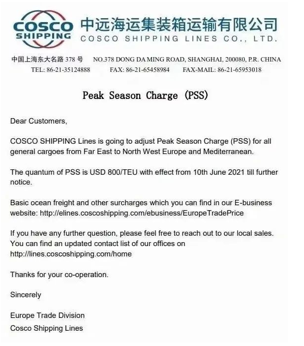 通知中我们可以知道中远海运在欧洲和地中海地区最新涨价通知,USD800/1600
