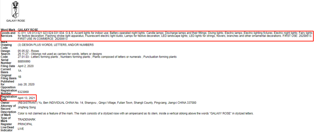 经查询发现,GALAXY ROSE于今年4月份被注册成商标,注册类别在11类,主要涉及灯饰类产品。